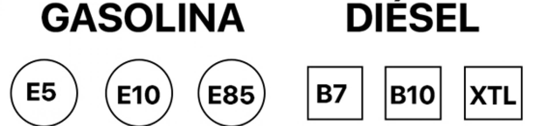 Las etiquetas de la gasolina serán redondas, e incluyen una letra y un número. La letra hace referencia al tipo de combustible y el porcentaje máximo de bioetanol incluido. En este caso, la E de etanol y los diferentes porcentajes.